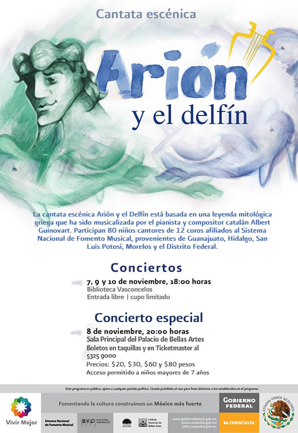 Con la dirección artística y musical de Alejandro León, titular de la Coordinación de Coros del Sistema Nacional de Fomento Musical (SNFM) del Conaculta y el trazo escénico de Guillermo García Proal, una selección de 140 niños de Guanajuato, Hidalgo, San Luis Potosí, Morelos y el D.F evocarán el canto de Arión y el delfín, en el Palacio de Bellas Artes, el próximo 8 de noviembre, donde el oleaje del Mediterráneo y la travesía de este personaje de la mitología griega serán aludidos en este montaje escénico-vocal en el que también participarán 2 cantantes, 1 narrador y 9 músicos profesionales.