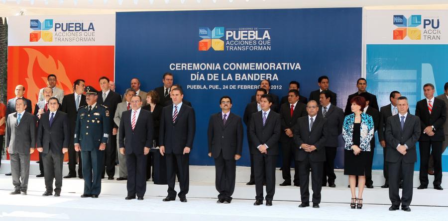 Puebla, Pue.-En el Zócalo capitalino se dieron cita autoridades estatales y locales, representantes de los Poderes Legislativo y Ejecutivo, encabezadas por el Gobernador Rafael Moreno Valle, para presenciar la ceremonia conmemorativa del Día de la Bandera Nacional, con el izamiento del lábaro patrio, la presencia de 125 escoltas escolares y la interpretación del himno nacional