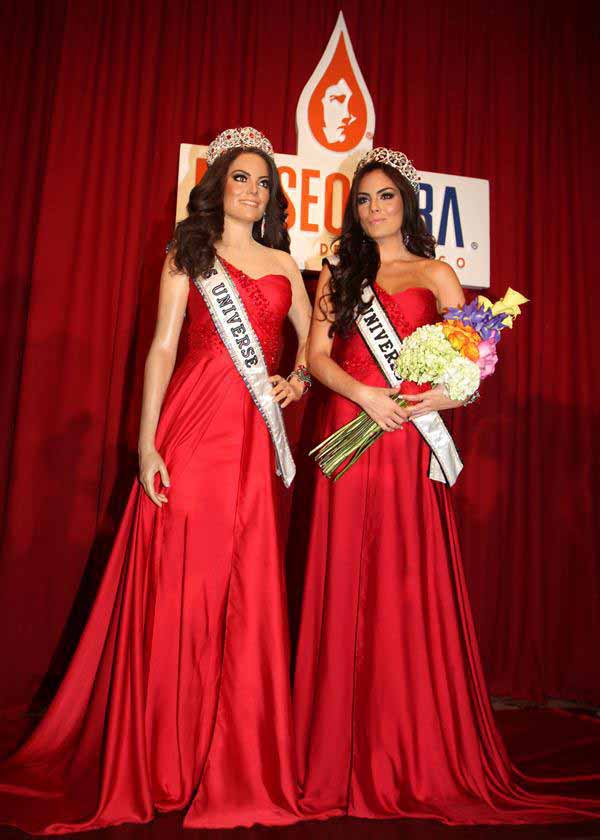 La figura porta el elegante vestido rojo con el que ganó la corona de Miss Universo en 2010, el cual diseñó el mexicano Benito Santos, así como la joyería que lució en aquel certamen.