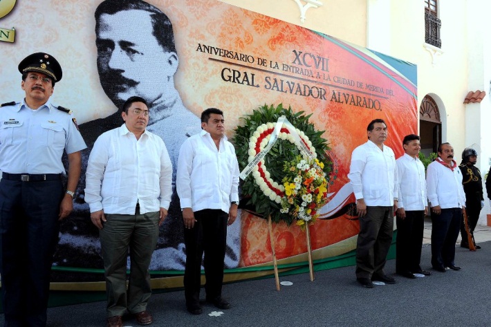 Mérida, Yucatán, 19 de marzo de 2012.- Con un llamado a continuar la búsqueda de la justicia social para lograr una sociedad más compasiva y comprensiva, autoridades estatales y militares conmemoraron el XCVII aniversario de la entrada a la ciudad de Mérida del General Salvador Alvarado. En presencia del secretario General de Gobierno, Víctor Sánchez Álvarez, quien asistió en representación de la gobernadora Ivonne Ortega Pacheco, el orador oficial por los tres Poderes del Estado, Manuel Jesús Soberanis Ramírez, recordó la labor de destacado militar sinaloense, quien luchó por el progreso, la justicia e igualdad social en Yucatán. “Si de alguna manera tuviéramos que caracterizar al derecho mexicano en el siglo XX, sería por la búsqueda de una justicia social, uno de los valores fundamentales de nuestro sistema jurídico”, apuntó. Ante representantes de los Poderes Legislativo y Judicial, funcionarios estatales y municipales, Soberanis Ramírez señaló que a los jueces de primera instancia se les está encomendada la primera línea de defensa de los valores y principios del Estado social y democrático de Derecho. Nuestro más alto deber, abundó, es la observancia de la dignidad de las personas a través de nuestras resoluciones judiciales, aportando así, desde nuestro compromiso, el empeño de lograr una sociedad más compasiva y comprensiva hacía las personas de condición más vulnerable. Durante la ceremonia, realizada en el estadio que lleva en nombre del General revolucionario, el también juez sexto de lo penal del Poder Judicial del Estado destacó el legado de Salvador Alvarado, cuya llegada a Yucatán marcó un parteaguas en la historia del estado, al convertir a la entonces Comisión Reguladora del Mercado del Henequén en un poderoso instrumento estatal para reencauzar la economía. Además, continuó, promovió la organización de los trabajadores en sindicatos y el incremento de los salarios y estableció Juntas de Conciliación y Arbitraje, mismas que constituyen un antecedente preconstitucional en el Derecho del trabajo mexicano. En el evento, se reconocieron los esfuerzos hechos por el también ex gobernador de Yucatán en materia de educación, al expedir el 28 de mayo de 1915 una ley en la que se declaraba la educación laica, gratuita y obligatoria para todos los menores de 21 años. Asimismo, se resaltó la orden que emitió Salvador Alvarado para la liberación de los peones del campo, en su inmensa mayoría indígenas mayas, y a los empleados domésticos, la prohibición de la tutela y la curatela para que se les mantuviera arraigados, así como la disposición de que todos los trabajadores despedidos debieran ser indemnizados de acuerdo con los años de antigüedad trabajados. Tras el acto protocolario, el secretario General de Gobierno, junto con autoridades civiles y militares, depositó una ofrenda floral y realizó una guardia de honor en el inmueble deportivo que lleva el nombre del homenajeado. Al evento asistieron los presidentes del Tribunal Superior de Justicia, Marcos Alejandro Celis Quintal y de la Junta de Gobierno y Coordinación Política del Congreso del Estado, Víctor Caballero Durán, el representante de la X Región Militar, Ángel Antonio Cabrera y el secretario del Ayuntamiento de Mérida, Julio Ávila Novelo. |